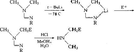 甲脒法比其它活化基团要灵活方便,用途更广。它易于由胺生成,也易于除去脒基而得到取代的胺。如果用手性胺形成甲脒,还可用于不对称合成,尤其用于天然存在的生物碱的合成。 非手性甲脒的合成及应用 甲脒可以用以下方法制备:(1)直接用N.N-二甲基甲酰胺二甲基缩醛(DMF-DMA)与一级胺反应,如: