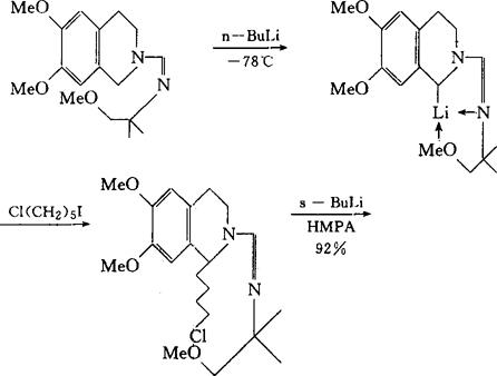 (3)用二甲胺基叔丁基甲脒与其它二级胺在甲苯中回流反应,可得到此二级胺的甲脒:  所得到的甲脒,在强碱作用下生成碳负离子,与亲电试剂作用后可以得到各种α-取代甲脒,经肼解或水解后即得α-取代的二级胺,例如: 1,2,3,4-四氢化异喹啉的甲脒在LDA的作用下,生成的碳负离子与MeI作用,得到1-甲基四氢异喹啉的甲脒,它还可以再次烃基化,生成1,1-二取代四氢异喹啉,即α-季碳化合物: 如应用双官能团的亲电试剂,可制得螺环和稠环异喹啉衍生物。例如用Cl(CH2)5I作亲电试剂可得到螺[环已烷-1,1′-(6′,7′-二甲氧基-1′,2′,3′,4′-四氢异喹啉)]。