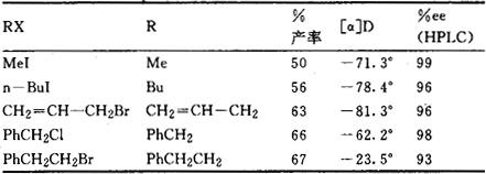 缬氨醇叔丁醚四氢异喹啉甲脒对1-烃基化产率和%ee的影响如下表所示:  从以上所列数据可以看出,虽然手性中心距α-碳有一定距离,但在此甲脒中有适宜作配体的基团,它的络合作用使其有一个为锂化和烃基化所需要的空间排列,也就是说在此手性体系中,由α碳形成的碳锂键会置于一个手性环境中,当它与亲电试剂作用时必有一高度非对映的立体选择性,除去此手性助剂后,便可得到高对映体过量的α烃基胺。用甲脒法不对称合成天然生物碱 含氮杂环手性甲脒作为不对称合成的媒介,已有了相当出色的成果,合成了四氢异喹啉类、吲哚类、八氢异喹啉类、氢化吡啶和氢化吡咯类生物碱。已合成的各类生物碱及它们的产率和对映体过量列举如下:(1)1,2,3,4-四氢异喹啉生物碱