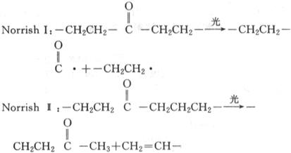 ROO·+InH→ROOH+In· (9) 有机材料的自动氧化机理研究最早由英国橡胶生产者研究协会组织,由Bateman、Bolland、Gee、Morris和Have等于40年代完成的。抗氧剂所必备的基本性质首先由Bickel、Kooyman、Thomas和Tolman等提出。第1个人工合成的稳定自由基2,2,6,6-四甲基-4哌啶-N-氧自由基,四甲基哌啶酮的N-氧自由基是由前苏联科学家Neiman、Rozantsev和Mamedova于1962年合成的。这些工作为受阻胺类、酚类和氮氧自由基型稳定剂的发展奠定了基础。稳定剂的效果除与其分子结构有关外还同它们的挥发性,在高分子基材中的迁移速率,溶解度及使用环境有关。一个理想的抗氧剂除具有形成稳定自由基的能力外,还应具备的性质为:呈分子水平的完全溶解于高聚物中;即使在高聚物表面也不会轻易地被损失掉;非挥发性的,将高分子同稳定剂通过化学键相结合可以显著的改善这些性能。制备与高聚物键合型的稳定剂方法有3种:一是乙烯类稳定剂同乙烯单体在合成过程中共聚;二是稳定剂同高分子的官能团进行反应;三是含有官能团的稳定剂同高分子反应。一系列可聚合或接枝型的稳定剂已由Vogl,Albertsson和Janovic描述。1977年3月在美国新奥尔良(New Orleans)召开了第1次高分子降解和稳定化的国际会议。会议的论题集中在新的,高性能稳定剂的制备;高分子稳定化与降解机理的研究;某些条件下的稳定性;新的聚合过程对高分子稳定性的影响以及高分子热氧化的研究。1989年3月在瑞士召开的第11届会议上一些新的研究方向表现在:高分子在受热,热氧化,臭氧、光氧化、水解,辐照及微生物作用下的降解问题,特别是在300℃以上高温条件下和加工条件下的热稳定性问题尤为引人注目;关于聚烯烃和聚氯乙烯老化研究论文开始减少,转而注重于高分子共混及其复合材料的老化研究;热氧化和光氧化稳定剂的合成及其作用机理的研究仍是研究的热点,高分子型稳定剂显示出很大的优越性;在改进高分子老化研究方法的新技术是将萤光技术应用到高分子表面层的热和光氧化降解研究。另一方面,人们正在利用高分子降解这一特性来消除随弃性塑料及塑料地膜对全球所造成的环境污染,可控制降解塑料的研究已成为当前高分子学科中最重要的课题之一。最有适用价值的塑料降解技术有两大类:紫外光降解和生物降解。光降解的机理主要有两种:一是认为光氧化过程包括链引发,氧化繁殖和链终止3步。第2种机理是酮光降解作用,称之为Norrish Ⅰ型和Ⅱ型: